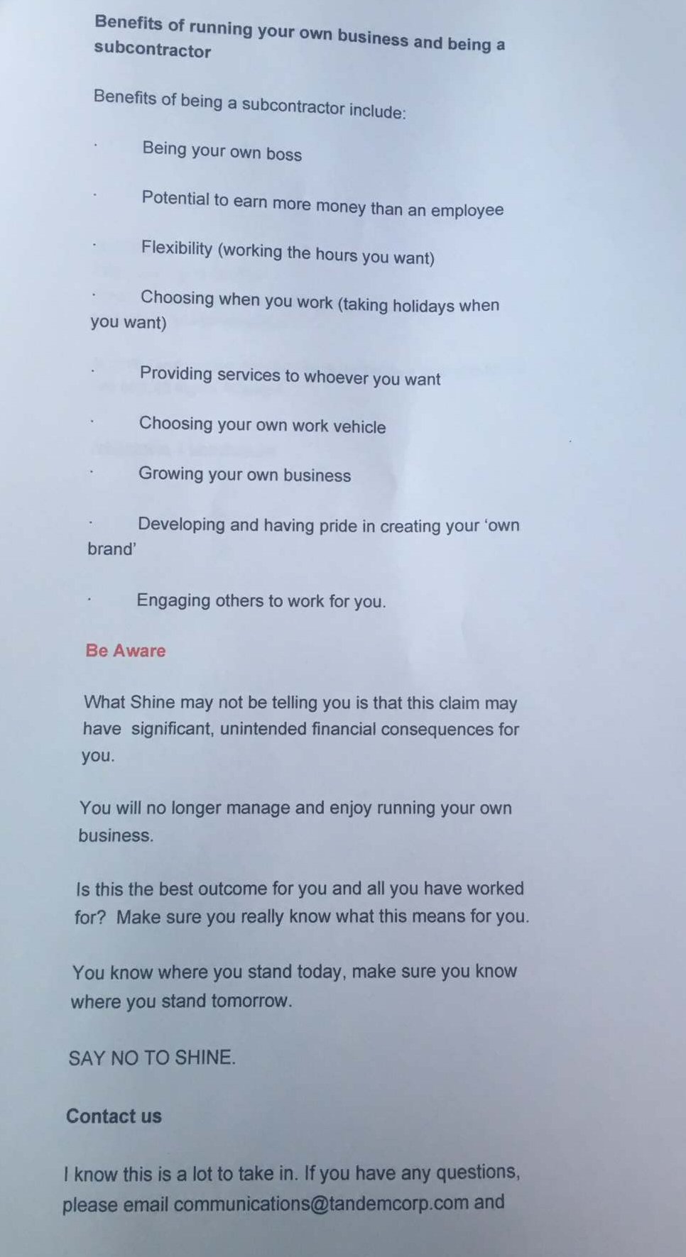 (or contractors) that they should not contact Shine Lawyers. See the letter below.